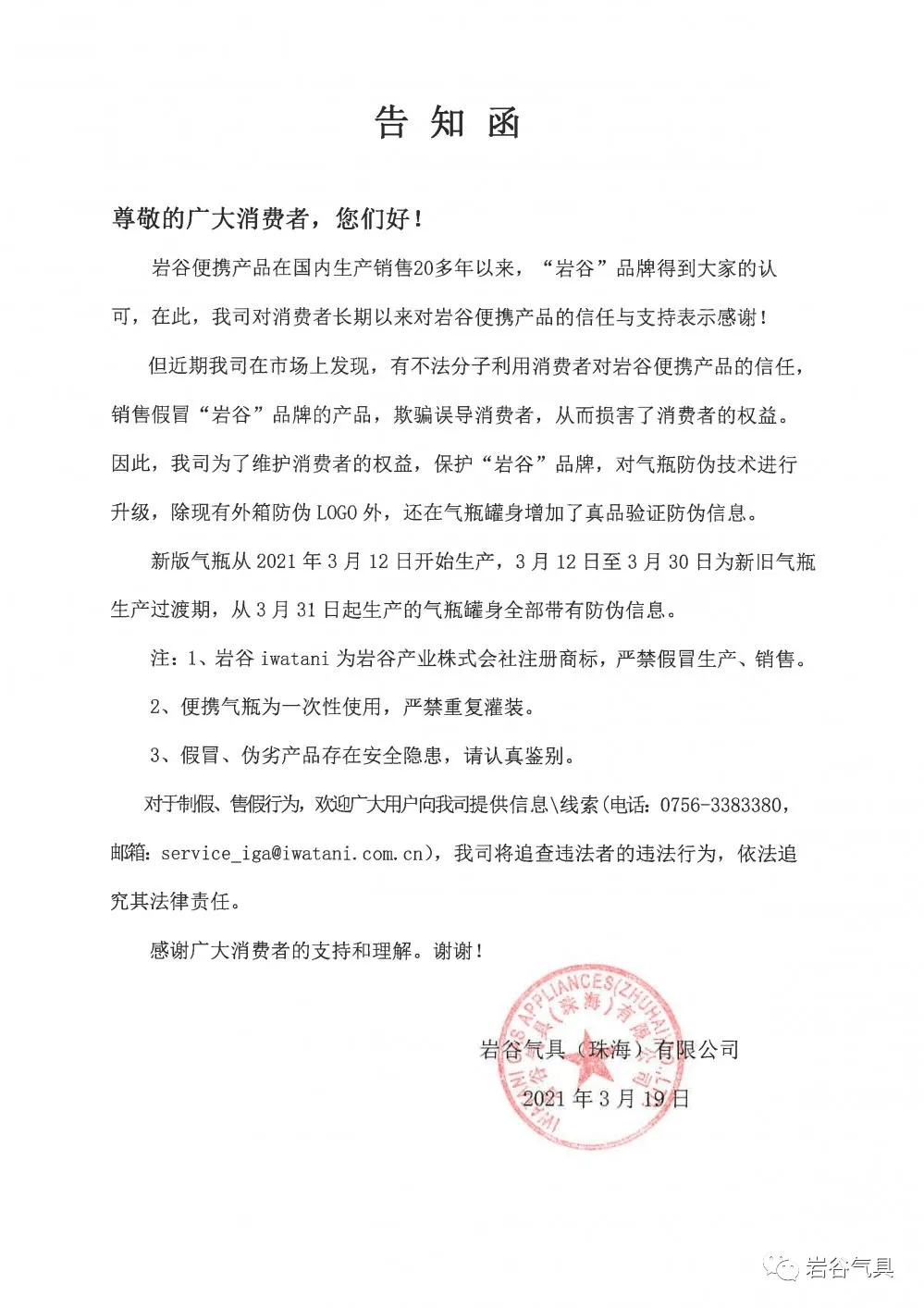 近期發(fā)現(xiàn)市場上銷售假冒“巖谷”品牌的產(chǎn)品,為了維護(hù)消費(fèi)者的權(quán)益,保護(hù)“巖谷”品牌,對氣瓶防偽技術(shù)進(jìn)行了升級,除現(xiàn)有外箱防偽LOGO外,還在氣瓶罐身追加了真品驗(yàn)證防偽信息。 2021年3月12日至3月30日為氣瓶新舊版生產(chǎn)過渡期,3月31日起生產(chǎn)的氣瓶,罐身全部帶有防偽信息。